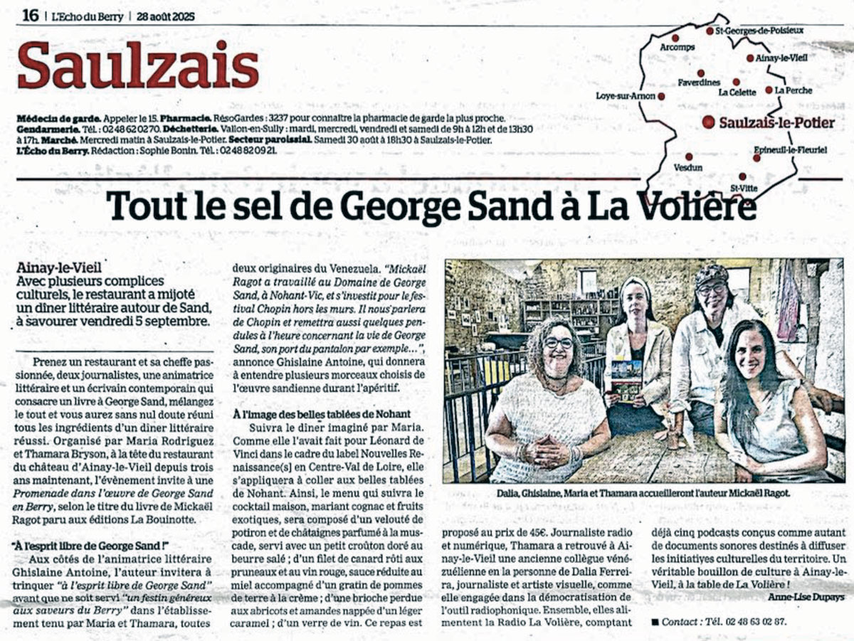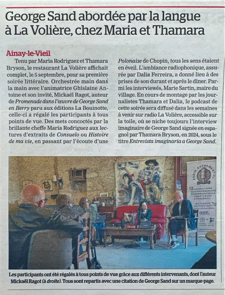 Château d'Ainay-le-Vieil - Article paru dans Le Berry républicain le 11 septembre 2025 - George Sand abordée par la langue à la Volière chez Maria et Thamara
