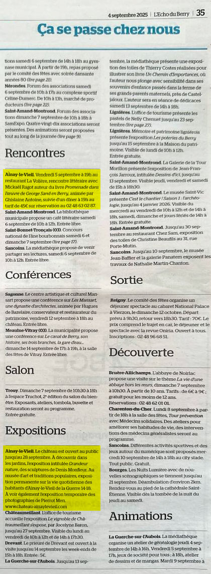 Château d'Ainay-le-Vieil - Article paru dans L'écho du Berry le 4 septembre 2025 - Ça se passe chez nous Rencontres et expositions