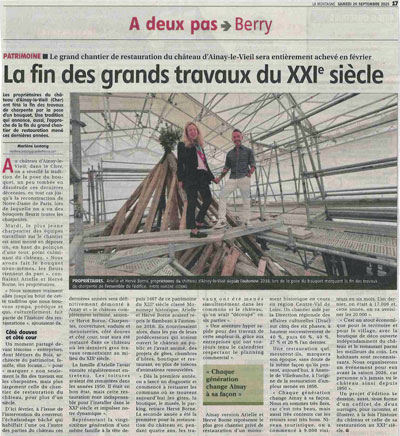 Château d'Ainay-le-Vieil - Article paru dans Le Berry républicain le 19 septembre 2025 - La fin des travaux du XXIe siècle-Arielle et Hervé Borne sur les charpentes du château
