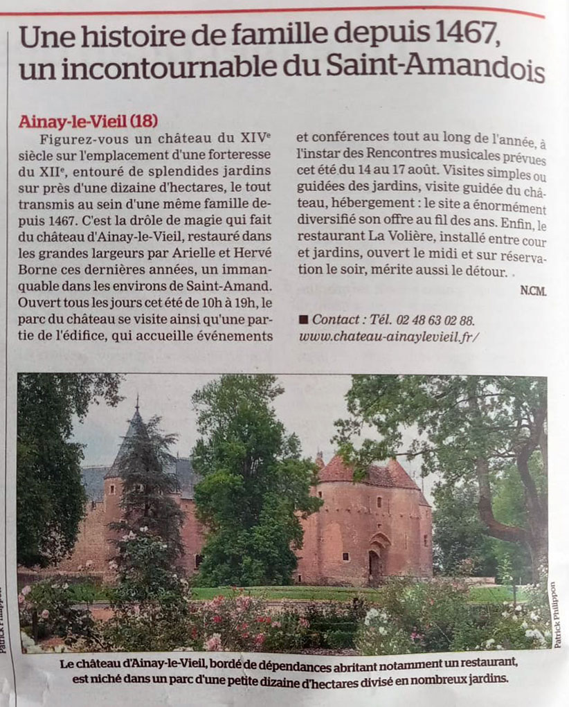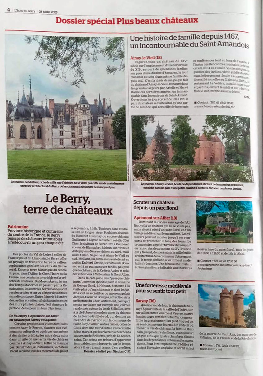 Revue de presse du Château d'Ainay-le-Vieil 2025Juil 2025 Arte : « L’héritage de Jacques Cœur »Regarder l’émission (à partir de 19 min 30) Juil 2025 L’Écho du BerryRevue de presse du Château d’Ainay-le-Vieil, L’écho du Berry « Sélection les plus beaux châteaux »-détail, 24 juillet 2025 Revue de presse du Château d’Ainay-le-Vieil, L’écho du Berry « Sélection les plus beaux châteaux », 24 juillet 2025 Revue de presse du Château d’Ainay-le-Vieil, L’écho du Berry « Sélection les plus beaux châteaux », 24 juillet 2025 Juil 2025 Connaissance des artsLire l’article Juil 2025 Connaissance des artsJuin 2025 Le Berry républicain – Heures d’été20250630-AINAY-Heures-d’été-PAGES Juin 2025 L’Écho du BerryJuin 2025 L’écho du BerryJuin 2025 L’écho du BerryJuin 2025 L’écho du BerryJuin 2025 L’écho du Berry Page 3 of 22 1 2 3 4 … 22